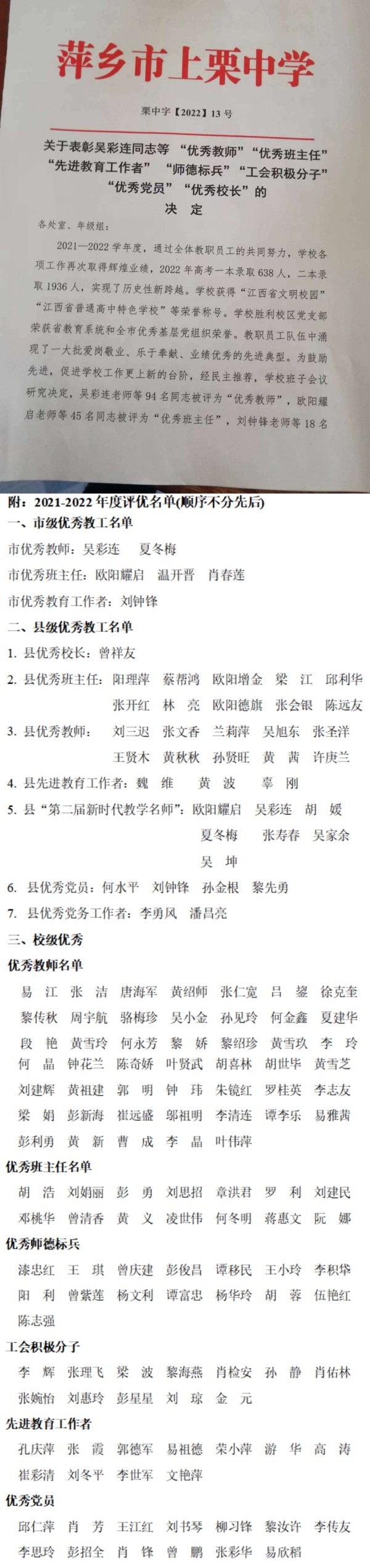 上栗中學(xué)班子成員周根華宣讀《關(guān)于表彰吳彩連同志等“優(yōu)秀教師”“優(yōu)秀班主任”“先進(jìn)教育工作者”“師德標(biāo)兵”“工會積極分子”“優(yōu)秀黨員”“優(yōu)秀校長”的決定》(栗中字【2022】13號)。