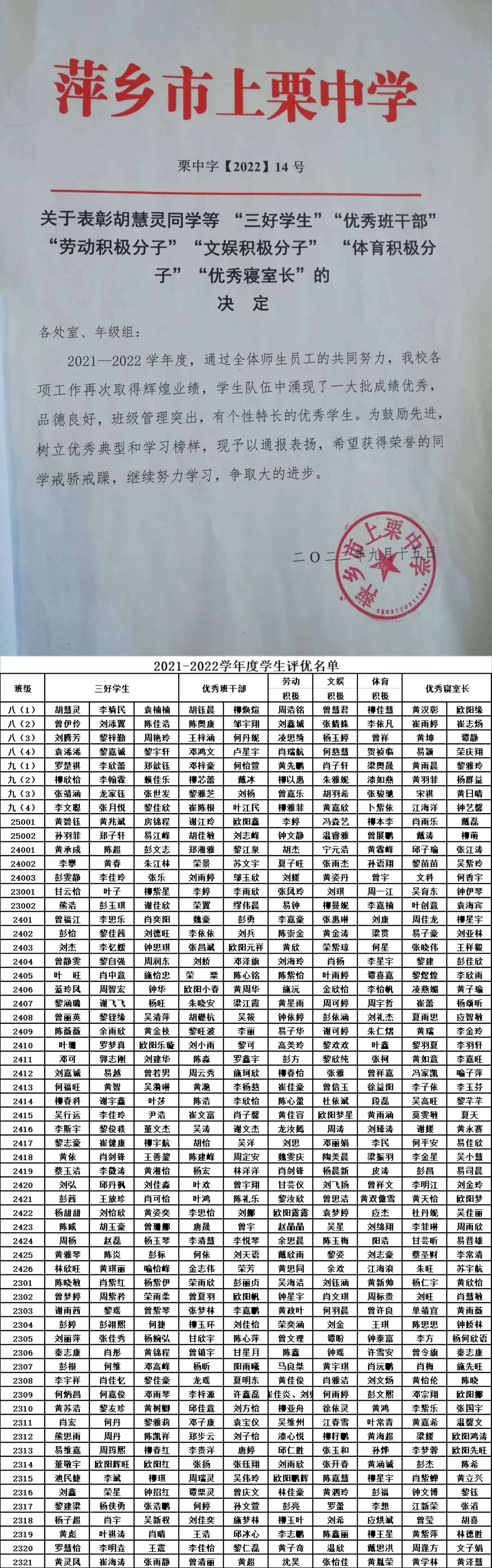 上栗中學(xué)黨總支副書記陳紹斌宣讀《關(guān)于表彰胡慧靈同學(xué)等“三好學(xué)生”“優(yōu)秀班干部”“勞動積極分子”“文娛積極分子”“體育積極分子”“優(yōu)秀寢室長”的決定》(栗中字【2022】14號)。