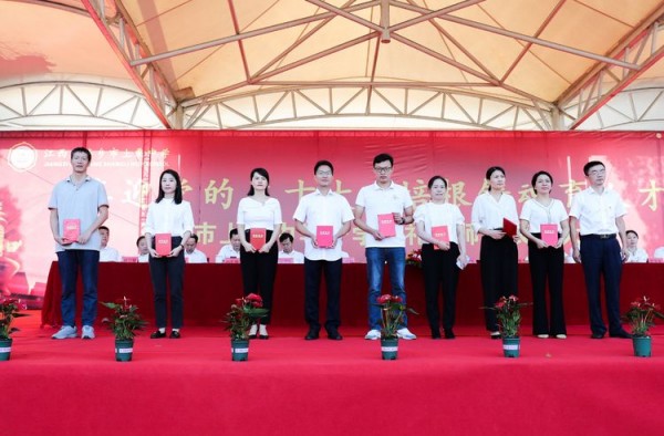 上栗中學(xué)副校長余忠良為縣“第二屆新時代教學(xué)名師”和縣先進(jìn)教育工作者頒獎。