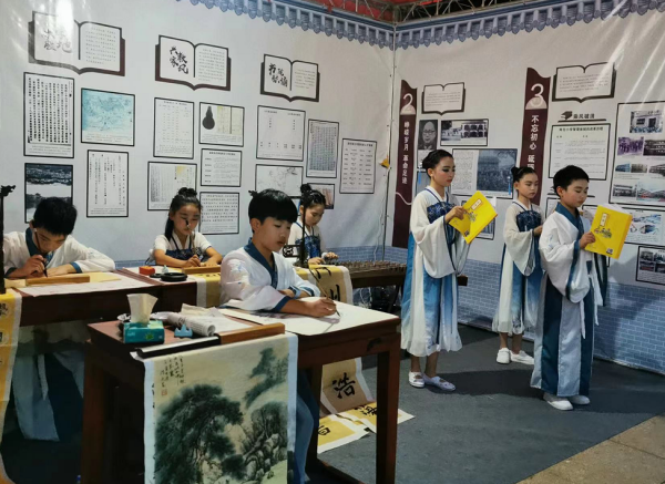 瞧,坊間里有三位學生現(xiàn)場表演書法及作水墨畫,在一位學生彈奏古箏的背景音樂下有三位學生誦讀。