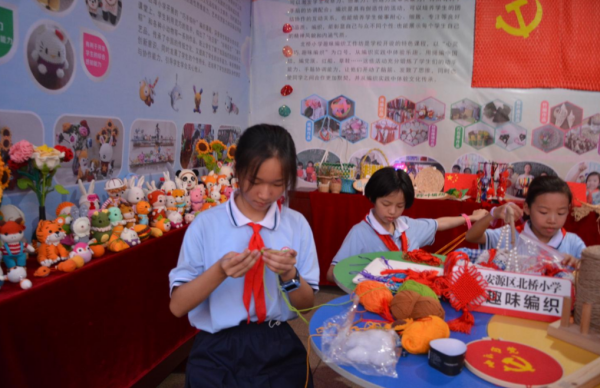 萍鄉(xiāng)市安源區(qū)北橋小學趣味編織工作坊是學校開設的特色課程,以“心靈手巧,趣味編織”為口號,從編織實踐中體驗樂趣。用繩編中國結,黨旗、紅船、草鞋……這些活動充分鍛煉了學生們的動手能力、手腦協(xié)調能力,讓他們開動了腦筋、發(fā)散了思維,同時也使同學之間合作更加默契,并從編織實踐中體驗文化傳承。