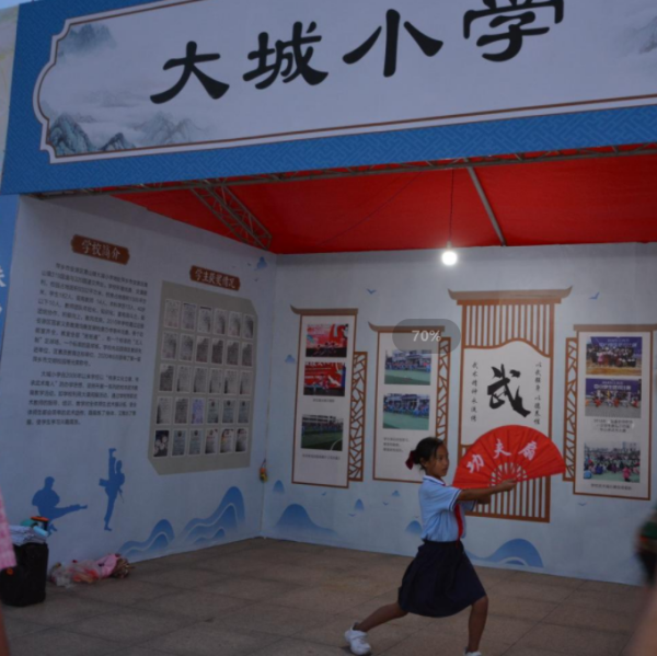 圖中看到的是大城小學功夫扇展示,這套功夫扇是根據(jù)高年級孩子的身心發(fā)育規(guī)律,針對女孩子由于身體發(fā)育而產(chǎn)生的害羞心理進行編排。將舞蹈融入武術中,既能讓孩子們達到鍛煉身體的目的,又能緩解女孩子的尷尬,還能體現(xiàn)出武術“剛柔兼并”的特點。