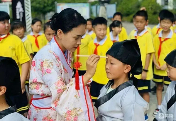 所謂“朱砂啟智”就是由師長用朱砂為剛?cè)雽W(xué)的孩子在額頭正中點上紅痣?!梆搿蓖ā爸恰保馕堕_啟智慧,以此寄托美好愿望,從此心明眼亮,好讀書、讀好書、讀書好。
