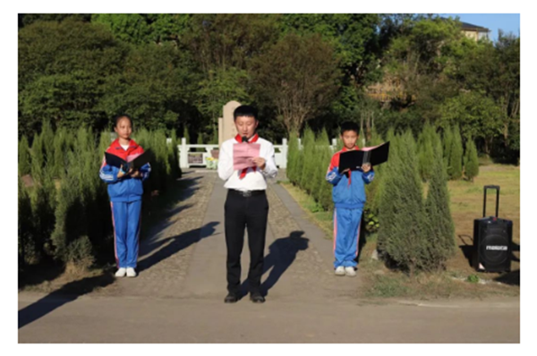 伴隨著莊嚴(yán)的《出旗曲》,少先隊(duì)旗手與護(hù)旗手們邁著整齊的步伐,精神抖擻地進(jìn)行莊嚴(yán)的出旗儀式,全體少先隊(duì)員齊唱中國(guó)少年先鋒隊(duì)隊(duì)歌《我們是共產(chǎn)主義接班人》,用嘹亮的歌聲表達(dá)對(duì)少先隊(duì)組織的熱愛。在黃靜源烈士紀(jì)念碑前,烈士后代和6位少先隊(duì)員像當(dāng)年安源兒童團(tuán)成立時(shí)的7名小礦工般佇立在碑前莊嚴(yán)默哀,送上鮮花撫慰烈士的英魂?;顒?dòng)中,大隊(duì)長(zhǎng)宣布了新隊(duì)員名單,優(yōu)秀老隊(duì)員代表為新隊(duì)員佩戴上鮮艷的紅領(lǐng)巾。