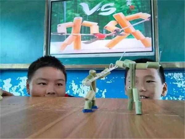 同學(xué)們根據(jù)課文中所描述的制作過程,利用竹子、細繩、鐵片等材料制作了屬于自己的竹節(jié)人,在手工制作的快樂中感受著傳統(tǒng)玩具的魅力。