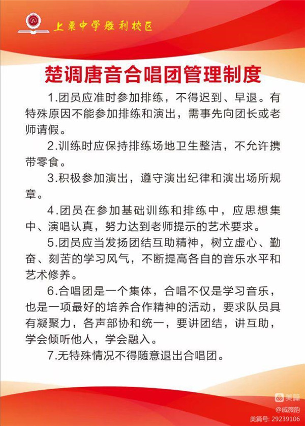 隨著楚調(diào)唐音合唱團(tuán)的不斷發(fā)展,合唱隊(duì)伍不斷壯大,為了使合唱團(tuán)的管理更加規(guī)范,課題組成員集思廣益,結(jié)合兄弟學(xué)校的合唱團(tuán)經(jīng)驗(yàn),制定了《楚調(diào)唐音合唱團(tuán)管理制度》。至此,隊(duì)員們有規(guī)可循,合唱團(tuán)的管理變得更加有序、更加合理。
