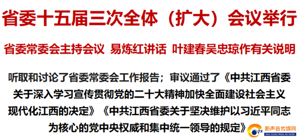 全會(huì)聽(tīng)取和討論了省委常委會(huì)工作報(bào)告;審議通過(guò)了《中共江西省委關(guān)于深入學(xué)習(xí)宣傳貫徹黨的二十大精神加快全面建設(shè)社會(huì)主義現(xiàn)代化江西的決定》和《中共江西省委關(guān)于堅(jiān)決維護(hù)以習(xí)近平同志為核心的黨中央權(quán)威和集中統(tǒng)一領(lǐng)導(dǎo)的規(guī)定》,省委副書記葉建春、吳忠瓊分別作《決定》《規(guī)定》有關(guān)說(shuō)明。