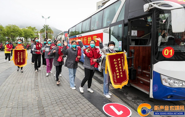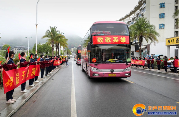 9時20分許,陳敏、劉爍、鮑峰庭等市領(lǐng)導(dǎo)目送援萍抗疫醫(yī)療隊隊員登上返程的大巴,并向他們揮手道別。隨著警笛鳴響、警燈閃爍,載滿援萍抗疫醫(yī)務(wù)人員的大巴車緩緩出發(fā),帶著萍鄉(xiāng)人民的美好祝福以及感恩之情踏上返程之旅。各界群眾、志愿者揮舞著小國旗夾道歡送,祝愿隊員們一路平安。