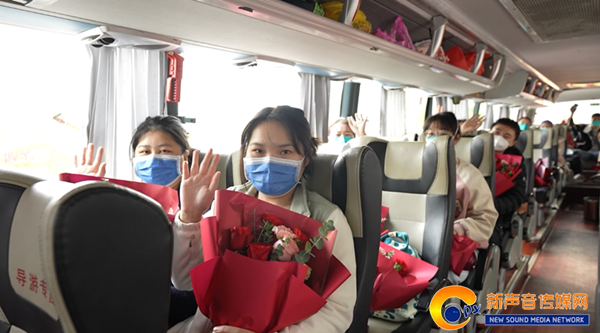 歡送儀式現(xiàn)場和接白衣戰(zhàn)士回家的大巴車上掛滿了寫有感謝、祝福的橫幅。早上8點,各界群眾代表早早來到援萍抗疫醫(yī)療隊入駐酒店,把一束束鮮花送到隊員們手上,對他們鼎力相助、火線馳援表示最誠摯的感謝。