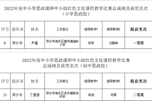 近日,在中共江西省委教育工委、江西省教育廳、江西省人力資源和社會(huì)保障廳聯(lián)合主辦的“2022年度江西省大中小學(xué)思政課和紅色文化課程比賽”中傳來(lái)喜訊,湘東區(qū)臘市鎮(zhèn)廟嶺小學(xué)尹富老師榮獲“小學(xué)組”一等獎(jiǎng)(全市唯一),湘東區(qū)老關(guān)鎮(zhèn)新華中學(xué)丁意麗榮獲“中學(xué)組”二等獎(jiǎng)。