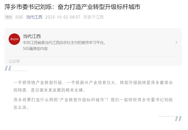 萍鄉(xiāng)市委書記劉爍在《當(dāng)代江西》發(fā)表署名文章:奮力打造產(chǎn)業(yè)轉(zhuǎn)型升級標(biāo)桿城市