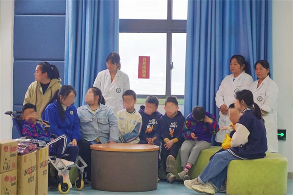 窗外小雨淅瀝,屋內(nèi)卻是溫馨舒適。教室里,輔助器具、牛奶、冬衣冬褲、尿不濕等價(jià)值2萬元的愛心物資整齊擺放。在老師的協(xié)助下,小朋友乖乖圍坐在教室里的弧形沙發(fā)上,嘰嘰喳喳好不歡樂。