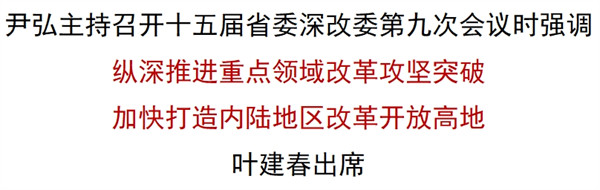 1月30日,省委書記、省委深改委主任尹弘主持召開十五屆省委深改委第九次會議,他強調,要全面貫徹黨的二十大精神,深入貫徹習近平總書記關于全面深化改革的重要論述和考察江西重要講話精神,聚焦“走在前、勇爭先、善作為”的目標要求,解放思想、鼓足干勁,開拓進取、擔當實干,縱深推進重點領域改革攻堅突破,加快打造內陸地區(qū)改革開放高地,為奮力譜寫中國式現(xiàn)代化江西篇章提供強勁動力。