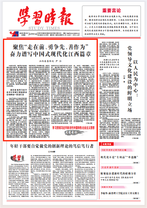 省委書(shū)記尹弘在學(xué)習(xí)時(shí)報(bào)撰文:聚焦“走在前、勇?tīng)?zhēng)先、善作為” 奮力譜寫中國(guó)式現(xiàn)代化江西篇章