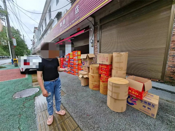 6月12日,南坑派出所民輔警在大嶺街進(jìn)行日常隱患排查工作時(shí),在某超市二樓儲(chǔ)物室發(fā)現(xiàn)多箱煙花爆竹。