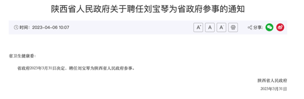 2023年3月31日,陜西省政府決定,聘任劉寶琴為陜西省人民政府參事。