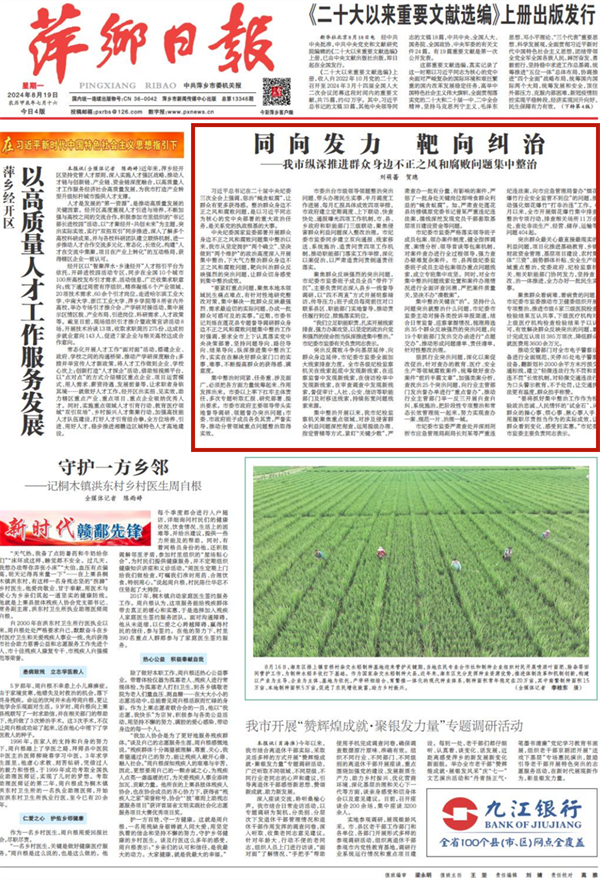 8月19日,《萍鄉(xiāng)日?qǐng)?bào)》刊發(fā)文章《同向發(fā)力 靶向糾治——我市縱深推進(jìn)群眾身邊不正之風(fēng)和腐敗問(wèn)題集中整治》。