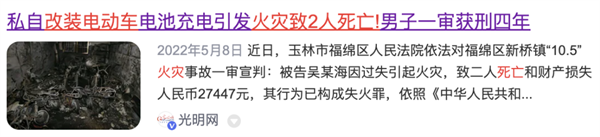 改裝電池后,接線端與電線可能會(huì)受損,如果此時(shí)隨意扣搭導(dǎo)線打火,容易引燃電池充電時(shí)內(nèi)部聚集的氫氣導(dǎo)致爆炸。