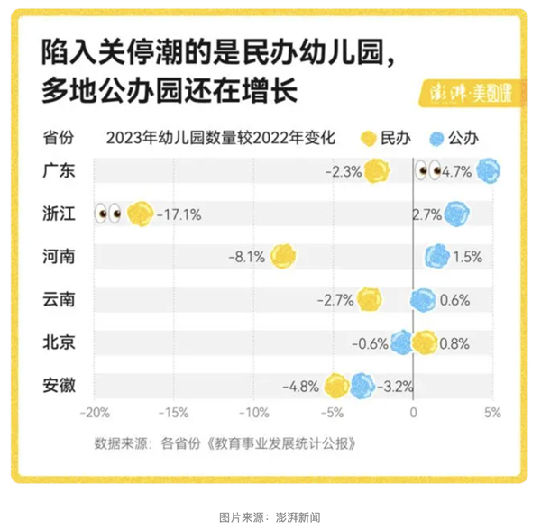 據(jù)澎湃新聞報(bào)道,民辦幼兒園關(guān)停潮背后,廣東、浙江、河南等地公辦幼兒園不降反增。以浙江為例,整個(gè)2023年民辦幼兒園數(shù)量從4300多家減少到了3600家不到,而公辦幼兒園增加了1267所。