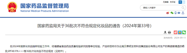 標(biāo)稱云南貝泰妮生物科技集團(tuán)股份有限公司生產(chǎn)的薇諾娜清透防曬乳SPF48 PA+++;(“貝泰妮生物”提出樣品真實性異議。經(jīng)云南省藥監(jiān)局審查,該企業(yè)未生產(chǎn)或者進(jìn)口過該批次抽檢不符合規(guī)定產(chǎn)品。)