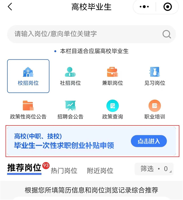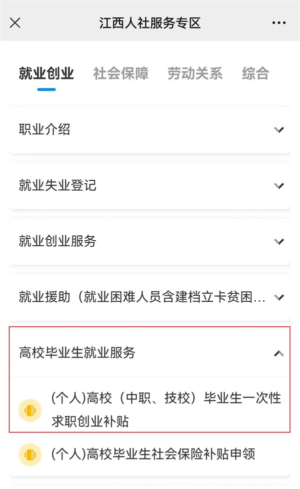B.進(jìn)入贛服通APP→部門專區(qū)→“人社專區(qū)”→我要補貼→高校(中職、技校)畢業(yè)生一次性求職創(chuàng)業(yè)補貼申領(lǐng)。