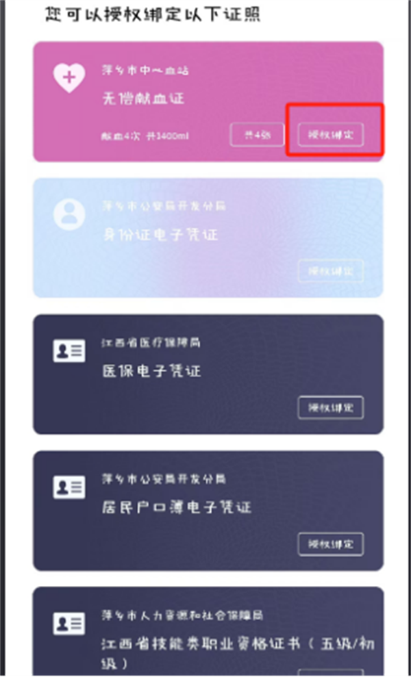 3.在“待授權(quán)證照”里選擇要關(guān)聯(lián)的電子證照進(jìn)行授權(quán)綁定。