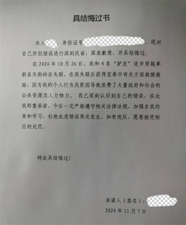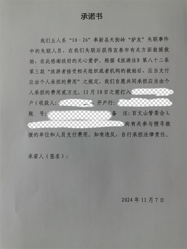 11月1日,就“10·26”奉新縣天狗嶺“驢友”失聯(lián)事件救援有關(guān)責(zé)任問題,省應(yīng)急管理廳牽頭,組織省法院、省檢察院、省司法廳、省消防救援總隊(duì)和宜春市有關(guān)人員會(huì)商。11月7日,宜春市政府召開警示教育約談會(huì),省應(yīng)急管理廳和宜春市、奉新縣兩級(jí)應(yīng)急管理部門、公安部門有關(guān)負(fù)責(zé)人與“驢友”面對(duì)面,對(duì)其違反政府管理規(guī)定,擅自進(jìn)入未開發(fā)開放區(qū)域探險(xiǎn)行為進(jìn)行了嚴(yán)肅的批評(píng)教育,并要求5名“驢友”作為完全民事責(zé)任人承擔(dān)相應(yīng)責(zé)任。“驢友”表示,感謝政府的關(guān)心關(guān)愛,后悔自己的魯莽行為,今后不再犯同樣的錯(cuò)誤,并簽署了《具結(jié)悔過書》。