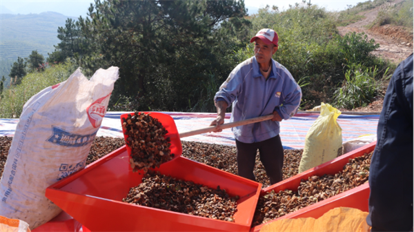 工人們將碩大圓潤的油茶果一锨锨鏟至傳送帶,由傳送帶不停地送入剝殼機,再將分離出的茶籽殼鏟到一旁,剝出的烏黑锃亮的油茶籽順勢落入筐內,現場一派忙碌,一派喜悅,汗水浸滿了每個人的臉頰,形成滿臉喜悅入畫來的幸福場景。