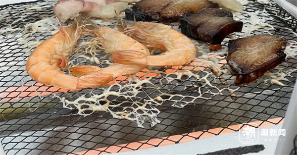 大約5分鐘,放在電暖器表面的蝦、肉等就熟了,豬肉和臘肉在高溫的作用下“滋滋冒油”。