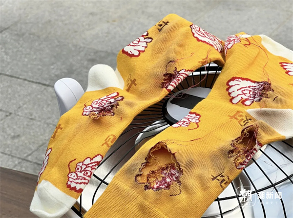 襪子受熱熔化出大洞,現(xiàn)場伴有燒焦味。