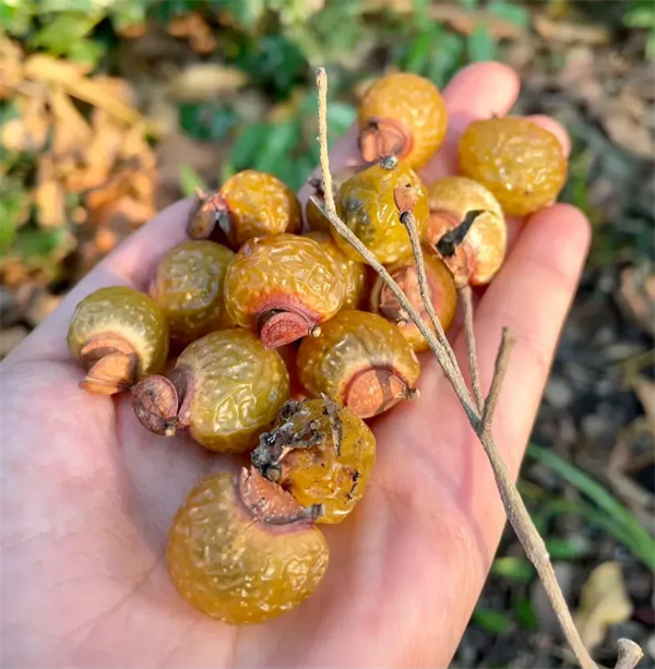 “無患子”的果實一般在11月、12月成熟,外形酷似桂圓,只是沒有桂圓那樣的外殼。其果皮中含有豐富的皂苷,用手揉搓極易產(chǎn)生豐富泡沫,在古代是一種常見的天然清潔劑。