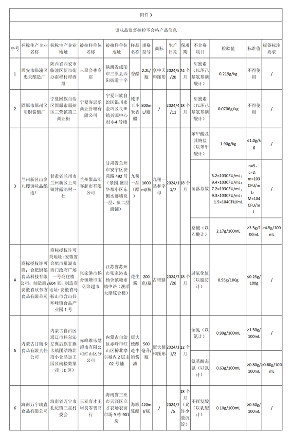 (二)陜西省咸陽市三原會林商店銷售的、標(biāo)稱陜西省西安市臨潼區(qū)忠天釀造廠生產(chǎn)的香醋,其中甜蜜素(以環(huán)己基氨基磺酸計(jì))檢驗(yàn)值不符合食品安全國家標(biāo)準(zhǔn)規(guī)定。