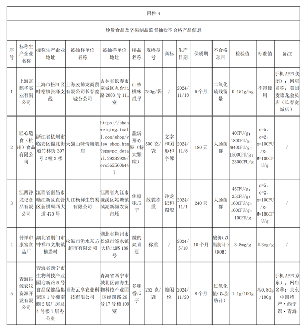 (三)美團(tuán)麥德龍會員店(長春寬城店)(經(jīng)營者為上海麥德龍商貿(mào)有限公司長春寬城分公司)在美團(tuán)(手機(jī)App)銷售的、標(biāo)稱上海富麒華實(shí)業(yè)有限公司生產(chǎn)的山核桃味瓜子,其中二氧化硫殘留量不符合食品安全國家標(biāo)準(zhǔn)規(guī)定。