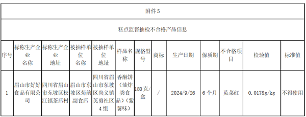 (五)四川省眉山市東坡區(qū)菊韻副食店銷售的、標(biāo)稱四川省眉山市好好食品有限公司生產(chǎn)的香酥餅(油炸類食品)(紫薯味),其中莧菜紅檢驗(yàn)值不符合食品安全國家標(biāo)準(zhǔn)規(guī)定。