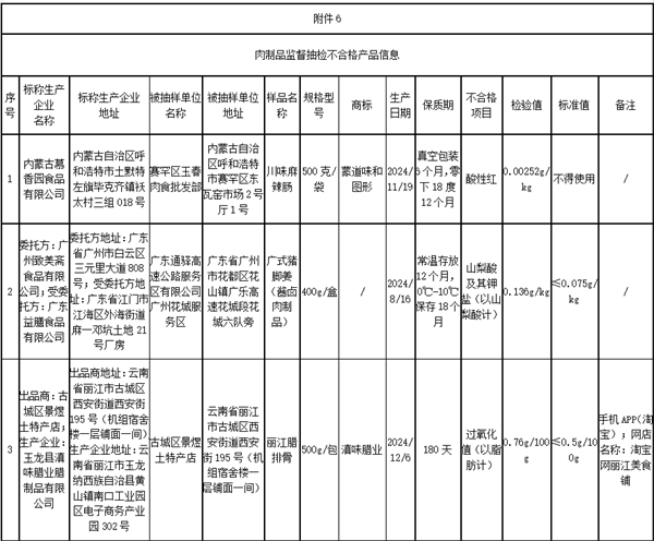 (六)內(nèi)蒙古自治區(qū)呼和浩特市賽罕區(qū)玉春肉食批發(fā)部銷售的、標(biāo)稱內(nèi)蒙古慕香園食品有限公司生產(chǎn)的川味麻辣腸,其中酸性紅檢驗(yàn)值不符合食品安全國家標(biāo)準(zhǔn)規(guī)定。