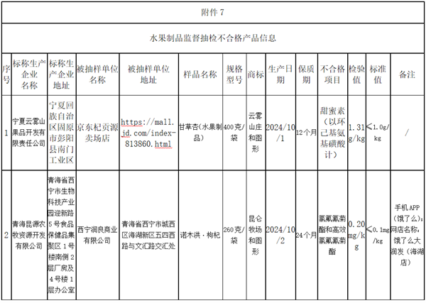 (九)京東杞貢源賣場店(經(jīng)營者為寧夏昱中貿(mào)易有限公司)在京東商城(網(wǎng)店)銷售的、標(biāo)稱寧夏云霧山果品開發(fā)有限責(zé)任公司生產(chǎn)的甘草杏(水果制品),其中甜蜜素(以環(huán)己基氨基磺酸計(jì))檢驗(yàn)值不符合食品安全國家標(biāo)準(zhǔn)規(guī)定。