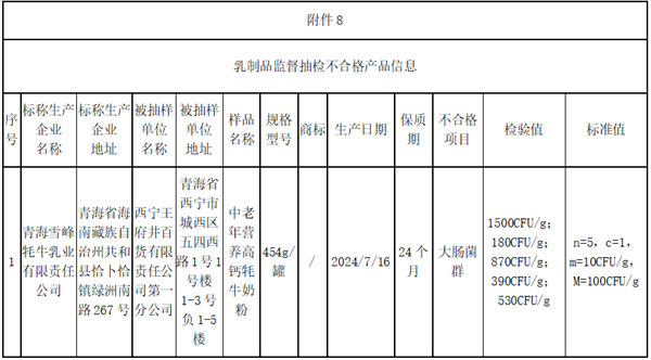 (一)青海省西寧王府井百貨有限責(zé)任公司第一分公司銷售的、標(biāo)稱青海雪峰牦牛乳業(yè)有限責(zé)任公司生產(chǎn)的中老年?duì)I養(yǎng)高鈣牦牛奶粉,其中大腸菌群數(shù)不符合食品安全國家標(biāo)準(zhǔn)規(guī)定。