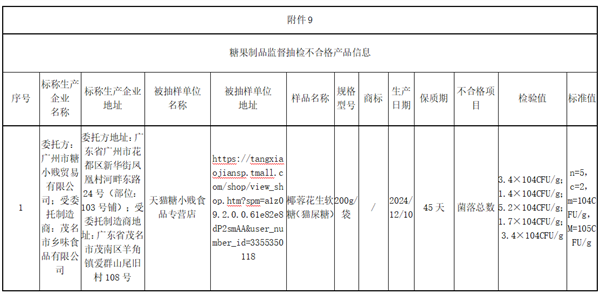 (五)天貓?zhí)切≠v食品專營店(經(jīng)營者為廣東省廣州市糖小賤貿(mào)易有限公司)在天貓商城(網(wǎng)店)銷售的、標(biāo)稱廣東省廣州市糖小賤貿(mào)易有限公司委托廣東省茂名市鄉(xiāng)味食品有限公司生產(chǎn)的椰蓉花生軟糖(貓屎糖),其中菌落總數(shù)不符合食品安全國家標(biāo)準(zhǔn)規(guī)定。