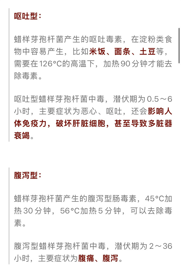 經(jīng)檢查,陳先生患上的是由蠟樣芽孢桿菌引起的食源性疾病。這種細(xì)菌多見(jiàn)于室溫下長(zhǎng)時(shí)間放置的米飯或炒飯中,所以由它產(chǎn)生的食物中毒,也被稱為“炒飯綜合征”,分為嘔吐型、腹瀉型。