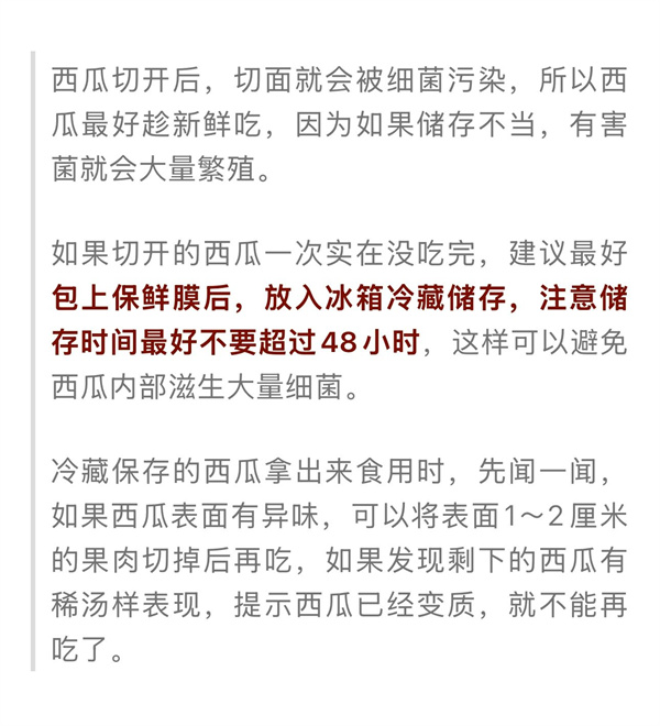 西瓜只要放置超過(guò)10個(gè)小時(shí),就算“隔夜西瓜”(比如10:00切開,放到20:00)。