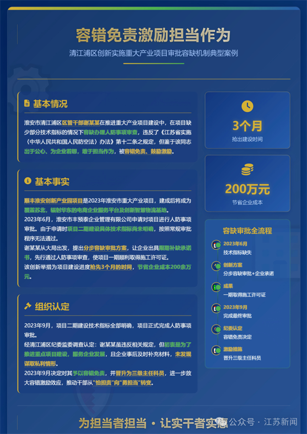淮安市清江浦區(qū)區(qū)管干部謝某某在推進(jìn)重大產(chǎn)業(yè)項目建設(shè)中,在項目缺少部分技術(shù)指標(biāo)的情況下容缺辦理人防事項審查,違反了《江蘇省實(shí)施〈中華人民共和國人民防空法〉辦法》第十二條之規(guī)定,但鑒于該同志出于公心、為企業(yè)著想,敢于擔(dān)當(dāng)作為,被容錯免責(zé)、鼓勵激勵。