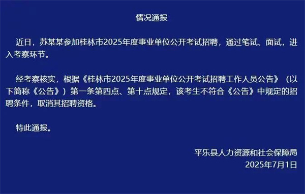 通報指出,經(jīng)考察核實,根據(jù)《桂林市2025年度事業(yè)單位公開考試招聘工作人員公告》第一條第四點、第十點規(guī)定,該考生不符合招聘條件,取消其招聘資格。