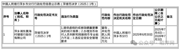 藍鯨新聞7月4日訊,近日,中國人民銀行萍鄉(xiāng)市分行發(fā)布了行政處罰信息公示表,劍指萍鄉(xiāng)湘東黃海村鎮(zhèn)銀行股份有限公司。