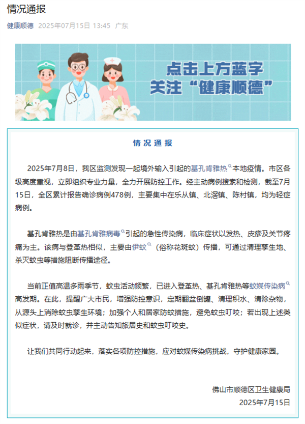 2025年7月8日,我區(qū)監(jiān)測發(fā)現(xiàn)一起境外輸入引起的基孔肯雅熱本地疫情。市區(qū)各級高度重視,立即組織專業(yè)力量,全力開展防控工作。經(jīng)主動病例搜索和檢測,截至7月15日,全區(qū)累計報告確診病例478例,主要集中在樂從鎮(zhèn)、北滘鎮(zhèn)、陳村鎮(zhèn),均為輕癥病例。