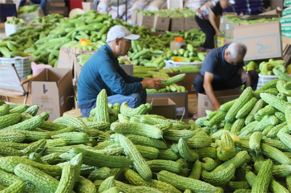 清晨5點(diǎn),基地已是一片繁忙。工人們目光如炬,手起瓜落,動作嫻熟地將符合標(biāo)準(zhǔn)的苦瓜輕放入桶——每一份小心翼翼,都是對創(chuàng)業(yè)果實(shí)最樸素的珍視。“蟲咬的、過熟的,統(tǒng)統(tǒng)歸田作肥,確保品質(zhì)!”基地負(fù)責(zé)人駱輝一邊指揮裝筐,一邊強(qiáng)調(diào)著近乎嚴(yán)苛的標(biāo)準(zhǔn)。他深知,盛夏是苦瓜的黃金期,也是挑戰(zhàn)期:“日采兩萬斤,拼的就是時效!苦瓜過一天就紅,身價(jià)盡失。我們凌晨開工搶‘鮮’,下午分揀打包,既要搶抓市場的‘窗口’,更要守住品質(zhì)的‘生命線’。” 這份對時效和品質(zhì)的極致追求,源于他骨子里的創(chuàng)業(yè)基因。這份“苦”差事背后,是駱輝作為創(chuàng)業(yè)者的人文溫度。他細(xì)數(shù)著防暑保障:十滴水、藿香正氣水、清涼油、花露水、綠豆湯、涼茶……“天氣太熱,不能讓工友冒險(xiǎn)。” 從“打工人”到“帶頭人”,他始終記得創(chuàng)業(yè)路上的同行者。