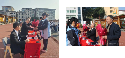 學(xué)生代表送上鮮花,為兩位退休教師獻(xiàn)上最真摯的祝福。一束束鮮花,代表著同學(xué)們最純真的敬意;一次次鞠躬,飽含著同學(xué)們對(duì)老師的不舍。