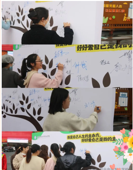活動伊始,主持人熱情開場,江錦根書記、分管副校長漆科先后致辭,寄語師生在忙碌的學(xué)業(yè)與工作中不忘關(guān)照內(nèi)心,在愛自己的旅程中收獲幸福。各位校領(lǐng)導(dǎo)和老師們在浪漫樹下鄭重簽名,為活動拉開序幕,也為每一份“悅己之心”送上期許。