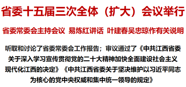 11月22日,中共江西省委十五屆三次全體(擴大)會議在南昌召開。 省委常委會主持會議。省委書記易煉紅受省委常委會委托作了工作報告和講話。 全會聽取和討論了省委常委會工作報告;審議通過了《中共江西省委關(guān)于深入學(xué)習(xí)宣傳貫徹黨的二十大精神加快全面建設(shè)社會主義現(xiàn)代化江西的決定》和《中共江西省委關(guān)于堅決維護以習(xí)近平同志為核心